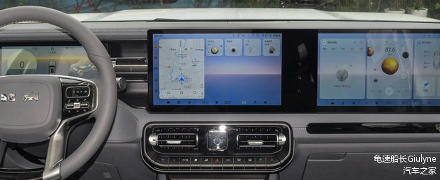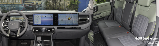 内饰设计的科技感与功能性平衡值得称道。12.8英寸中控屏与10.25英寸副驾屏的组合,既保留实体空调旋钮,又植入硬派SUV专属UI界面。与豹5的“旋转屏”、猛龙的“三屏互联”相比,BJ40的交互设计更强调驾驶专注度,其HUD系统可显示坡度、海拔、轮胎温度等专业数据。