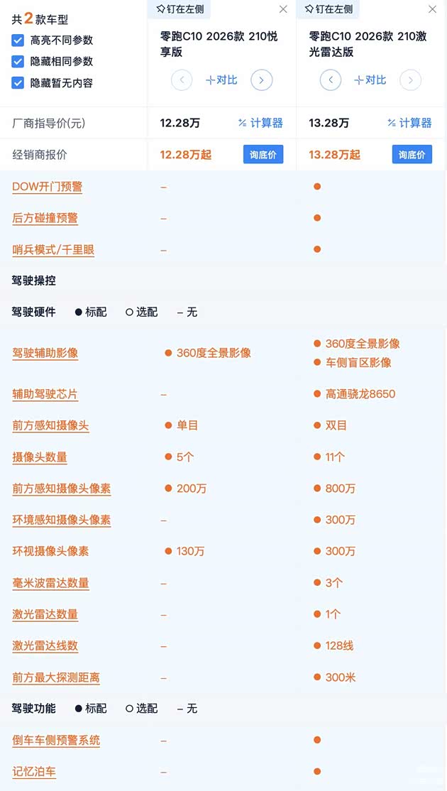 价格来看,作为全系价格最低的两款车型,两款增程版售价分别为210悦享版12.28万元,210激光雷达版在13.28万元,差价1万元。那么除了基本的动力系统相同之外,这两台车还有哪些差别呢?