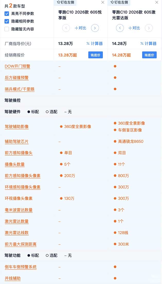 价格来看两台车依然相差1万元。而这两台车的配置差异,与增程版两台车完全一致,都是围绕激光雷达展开的。所以我们认为,如果是605悦享版和605激光雷达版,大家依然要按需购买。