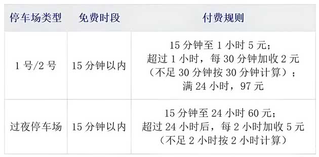 超时收费:停车时长超过24小时后,每2小时加收5元,不足2小时按2小时计费。