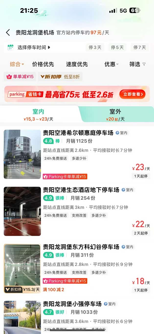 几个好友计划趁着年假结伴出游,为了能更随心所欲地规划行程,他们决定自驾前往龙洞堡机场。自驾的优势相当明显,大家既能方便地互相接送,还能轻松装下堆积如山的行李,不用在地铁、公交上挤来挤去,也不用操心出租车空间不够装不下所有东西。然而,龙洞堡机场官方停车场的收费着实不低,一天最高要 97 元。对于预算本就紧张的他们来说,这无疑是一笔不小的开支,让本就不宽裕的旅行预算雪上加霜。好在天无绝人之路,他们发现了一个超省钱的停车妙招。只需微信搜索小强停车,就能轻松预约机场周边的停车场。更惊喜的是,输入邀请码“58”,就能领取 38 元的停车抵扣券。通过小强停车平台,就能预订到龙洞堡机场附近价格亲民的停车场,在这里停车一天只需 20 元。这一下子就帮他们省下了不少旅行费用,让他们能毫无顾虑地尽情享受这场期待已久的旅程。