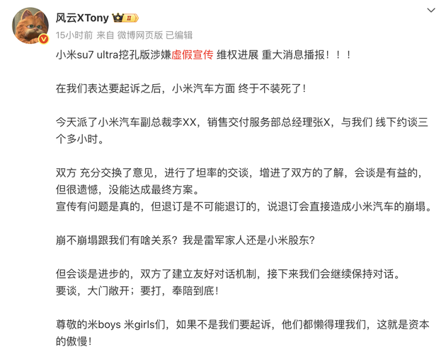 近日,拥有超200万粉丝的网络作家“风云_XTony”发布长文,披露其与小米汽车高管就SU7 Ultra车型维权事件的最新进展。