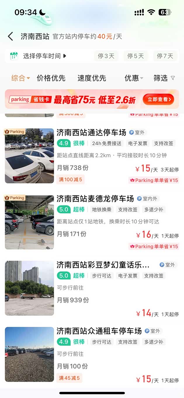 如果你不想被官方停车场的高价“劝退”,那么“小强停车”会是你明智的替代方案。通过平台提前预约济南西站周边正规停车点,每天只需14元,不仅节省了近三分之二的费用,还能提前锁定车位。