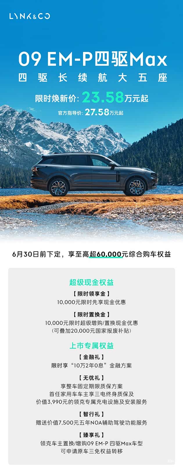 先给大家划重点:这台车官方指导价27.58万,现在到6月30日下定,能享受23.58万的限时焕新价,相当于直接省了4万。如果你打算置换或者增购,还能再拿1万补贴,要是旧车符合国家报废条件,还能叠加2万补贴,算下来最高能省7万。