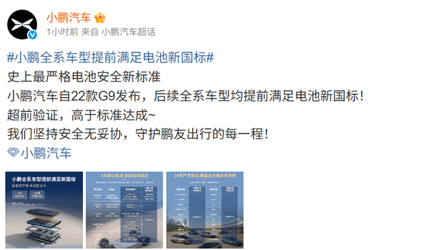 5月16日消息,今日小鹏汽车发文表示,小鹏自22款G9发布,后续全系车型均提前满足史上最严格电池安全新标准,而新标准将于2026年7月实施。