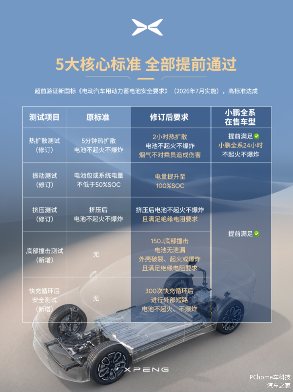 据悉,新国标主要有五大标准,在热扩散测试中要求2小时热扩散、电池不起火不爆炸、烟气不对乘员造成伤害,小鹏全系车型已经做到了24小时,且不起火不爆炸。而在新修订的振动测试、挤压测试、底部撞击测试、快充循环后安全测试中,小鹏汽车均提前满足要求。