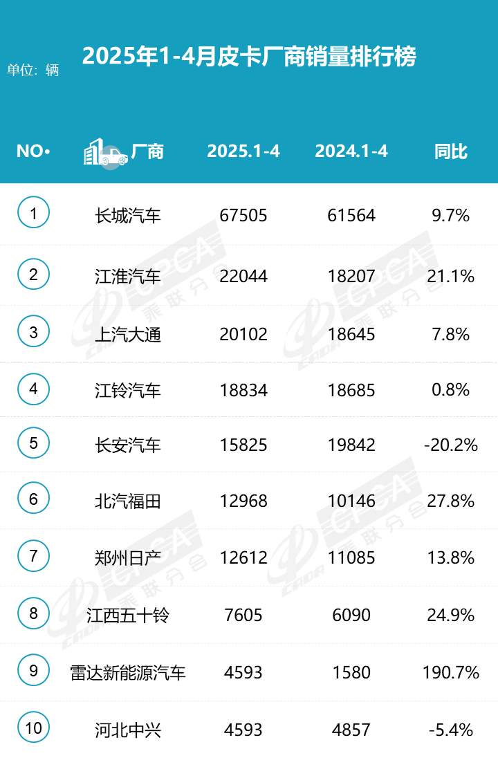 4月长城销量17500辆;江淮销量6165辆;上汽大通销量5845辆;江陵销量5016辆;郑州日产销量4063辆。