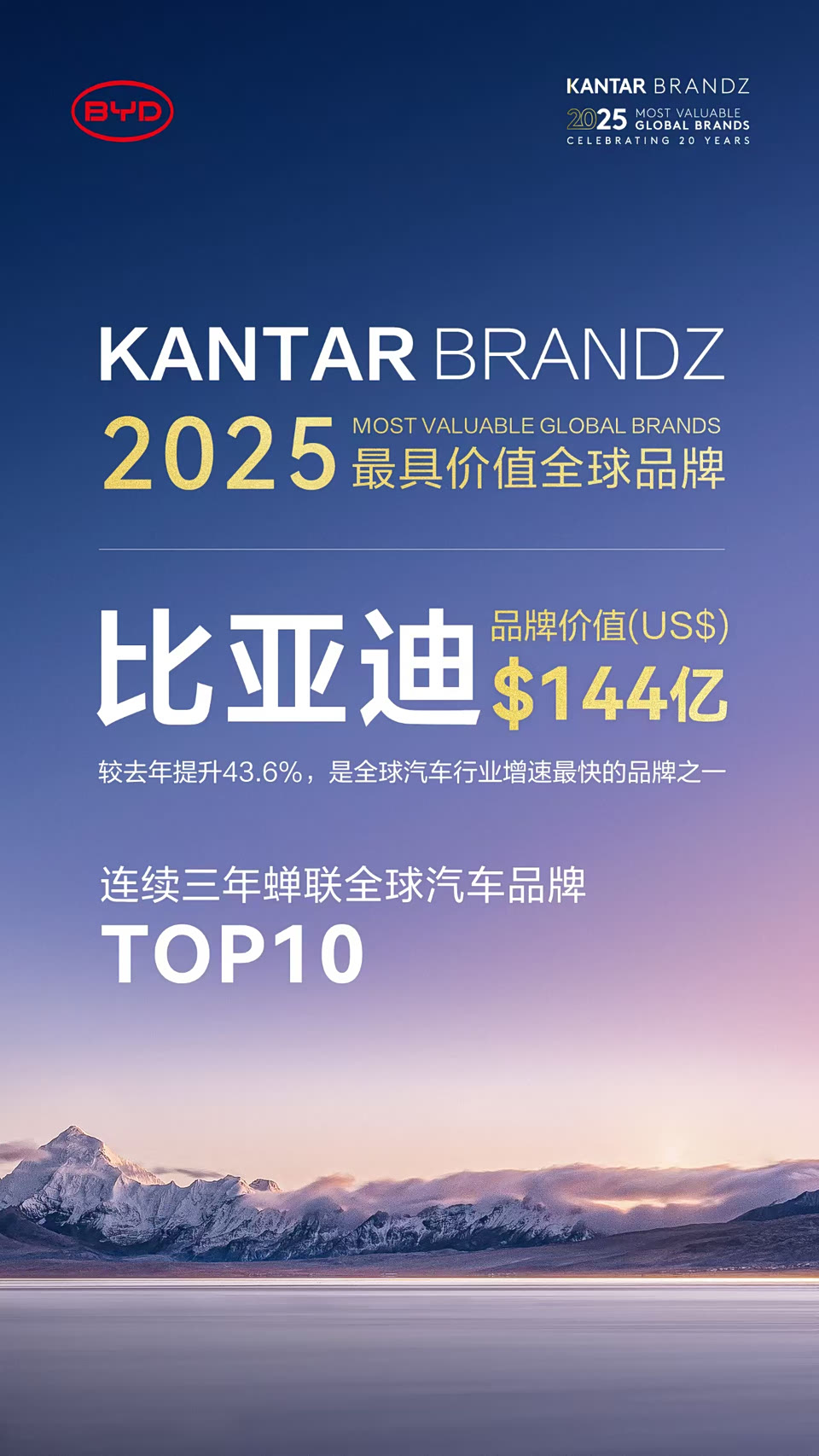 2025年5月15日,凯度BrandZ发布全球品牌价值榜单,比亚迪荣登全球汽车品牌榜第六名,同比激增43.6%,连续三年稳居前十,创中国汽车品牌历史新高。比亚迪2024年全球新能源汽车销量达427.21万辆,同比增长41.26%,蝉联中国及全球新能源市场销量冠军,并以全球化布局覆盖6大洲110余国。
