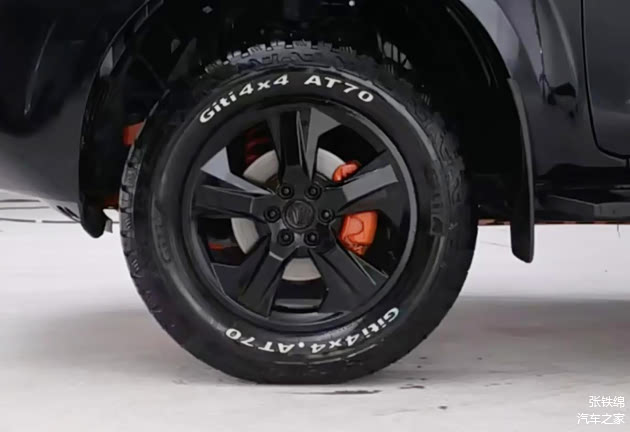 车身侧面部分,普通版镀铬车门把手、银色的上车踏板在这辆黑武士版上都改为了黑色涂装,轮毂也使用了黑色,刹车卡钳为红色涂装, 匹配的是AT70全地形轮胎,轮胎规格为255/60 R18。