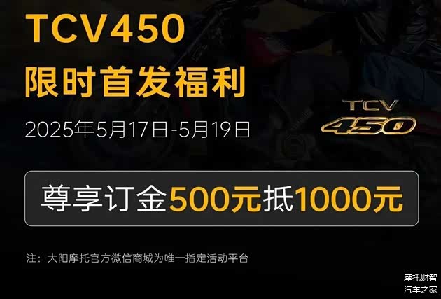 5月17日大阳在成都发布自家新品TCV450巡航车型,售价更是惊喜的来到了19980元,限时首发福利尊享订金500元抵扣1000元,目前国内的巡航车品类烟硝满天,大家早已打成了红海,