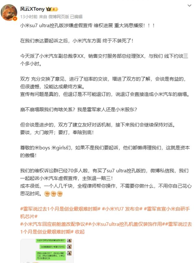 2025年5月15日晚, 小米SU7 Ultra“机盖门”事件进入关键阶段。车主代表与小米汽车高层进行了长达3个多小时的线下谈判,参与谈判的小米方代表包括副总裁李XX及销售交付服务部总经理张X,车主方则由网络作家“风云XTony”等维权代表出面。尽管双方都形容会谈“充分交换了意见,进行了坦率的交谈,增进了双方的了解,会谈是有益的”,但最终未能达成任何实质性解决方案。