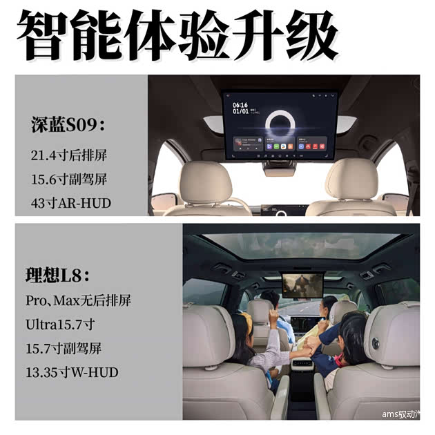 深蓝S09采用鸿蒙座舱HarmonySpace 5,支持人-车-家互联,大幅拓展生态互联体验,并且支持3D桌面、影视空间等先进功能,通过采用全新混合大模型Agent架构与音乐、影视等领域的AI能力进行整合,构建不同场景下的智能体验,“通人性”的语音交互结合7面双层隔音玻璃、20扬声器、后排21.4英寸3K屏,实现了智能座舱的强强联合。理想L8针对智能空间有着多维度的交互体验,“自研”是它的关键词,支持MindGPT的AI理想同学算是其最大亮点,但对于打造互联生态与增强用户粘性方面,华为乾崑智能汽车解决方案的优势还是更加明显。