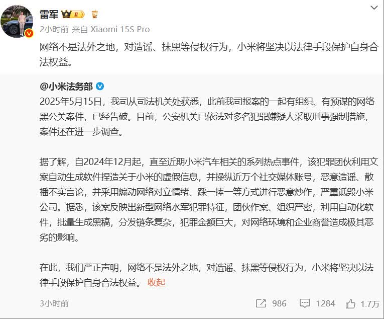 【小米接连出招,YU7即将发布,法务部也出手了!】自从小米宣布造车起,相关新闻就层出不穷,各种事件频发,甚至屡屡登上社交媒体“头条”。 日前小米频频发声,一方面小米表示5月22日小米即将召开发布会,推出手机SoC芯片小米玄戒o1及新车小米YU7。另一方面小米法务部则表示此前网络黑公关案件已经告破,并表示网络不是法外之地,对造谣、抹黑等侵权行为,小米将坚决以法律手段保护自身合法权益。 而在重磅发布会前夕法务部发声,无疑会起到一定的震慑作用,对此你怎么看?留言讨论吧!#小米YU7#