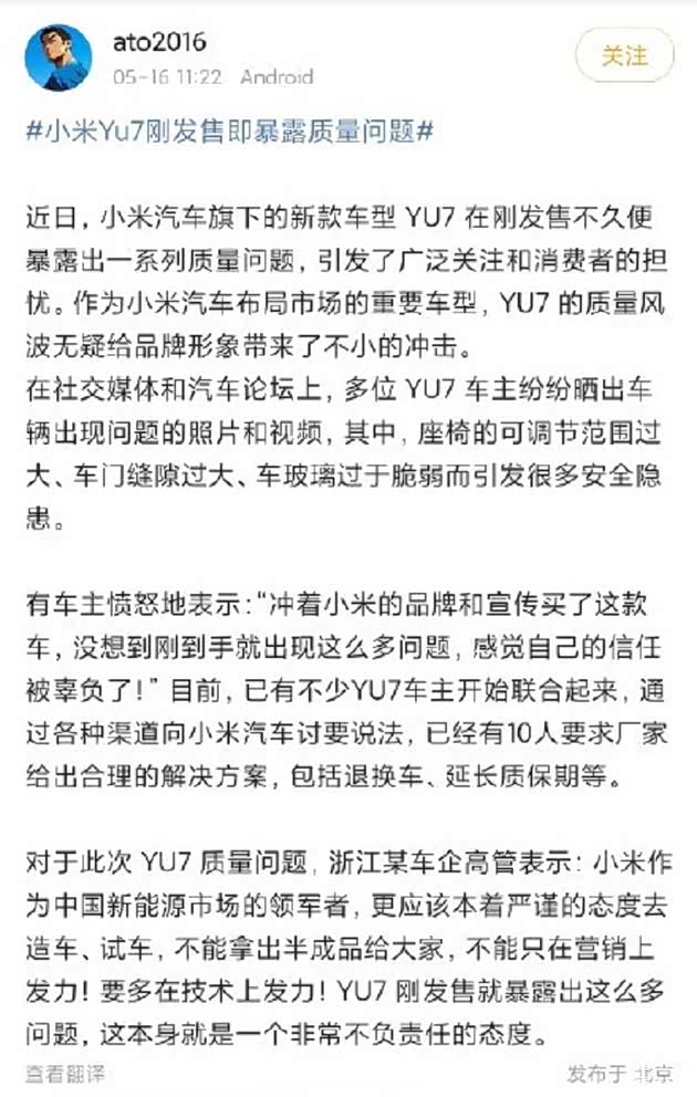 他们对小米 YU7 的 " 质量 " 非常不满意,纷纷 " 晒出 " 车辆出现问题的照片和视频,要求厂家给个说法。