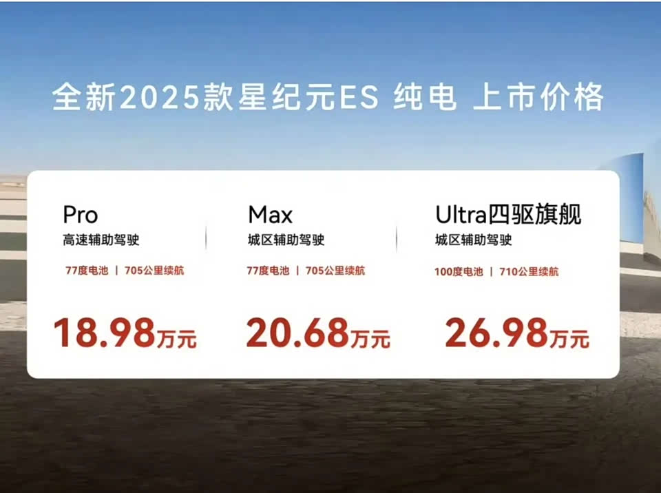 2025款星途星纪元ES纯电版上市,又降了两三万,最新售价18.98-26.98万。