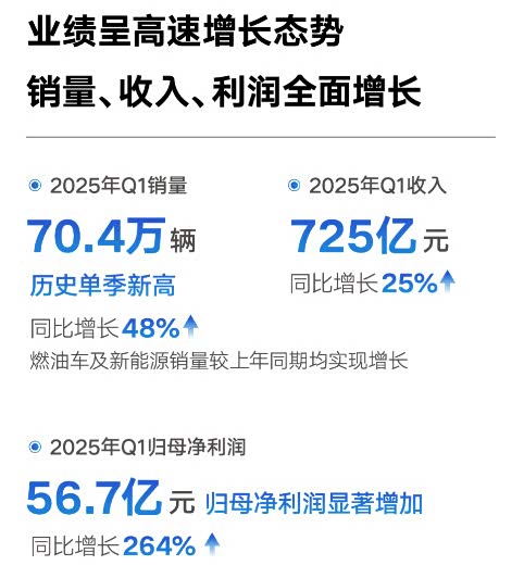 5月15日,吉利汽车发布2025年第一季度财报。从报表数据来看,即便汽车市场竞争持续白热化,吉利汽车依然逆市而上,保持了高速增长,在销量、收入和利润方面交出了一份满意答卷:一季度,销售车辆70.4万台,同比增长48%,创造了吉利汽车历史上单季度的新高。收入725亿元,同比增长25%。毛利总额达114亿元,归母净利润为56.7亿元,同比增长264%。