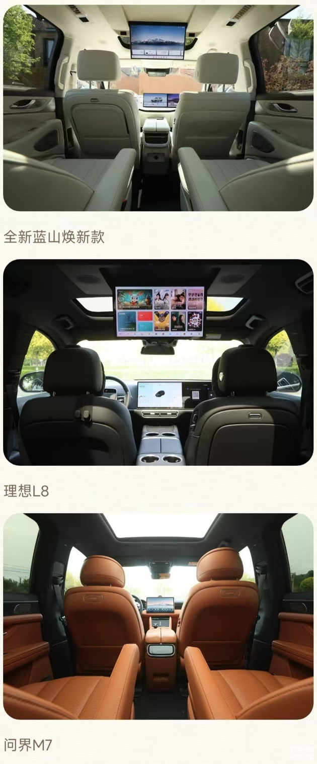首先从空间表现来看,全新蓝山焕新款以3050mm的轴距占据绝对优势。这不仅让前两排拥有宽敞舒适的乘坐体验,其第三排腿部空间也达到了826mm,即便是成年人长时间乘坐也不会感到局促。此外,它的后备厢容积设计灵活,基础容积为349L,最大扩展至1040L,无论是婴儿推车、露营装备还是家庭行李箱,都能轻松容纳。相比之下,理想L8的轴距为3005mm,虽然数据表现不错,但其第三排腿部空间为722mm,满员状态下稍显局促,特别是在长途驾驶时可能会影响乘坐舒适性。而313L的后备厢容积虽能应付日常通勤需求,但面对更多装载任务时略显不足。问界M7的2820mm轴距明显处于劣势,虽然通过优化座椅设计提升了空间利用率,但第三排的舒适性难以与前两者相提并论,而188L的后备厢容量几乎无法满足家庭长途旅行的储物需求。