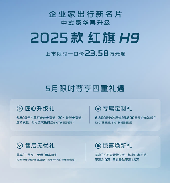 毫不客气的说,我认为H9是红旗品牌最好看的一款车。厂商指导价 32.98万,如今23.58万。对于一款正儿八经的后驱的中大型商务轿车,这个价格还是很给力的!