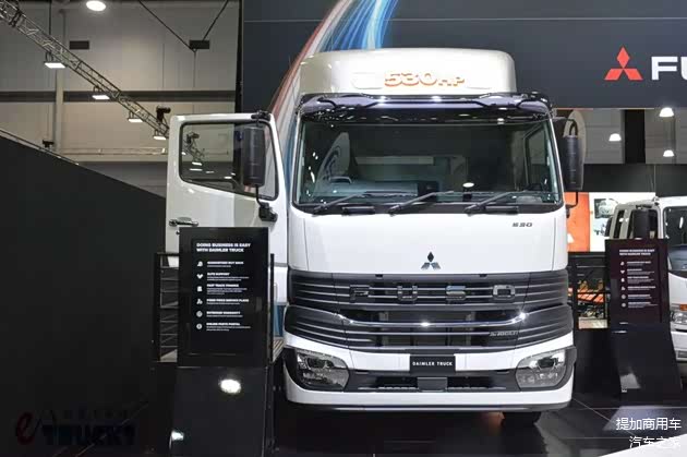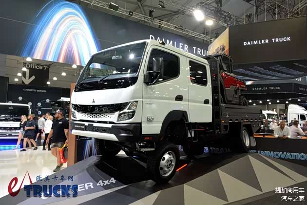 日本卡车的最后,让我们移步戴姆勒卡车集团展位。在这里,戴姆勒卡车旗下三菱扶桑携多款车型参展。展台最前方是一台扶桑Shogun“将军”重卡,属于最新一代车型。相较前代车型而言,本车采用了全新的驾驶室,并配备新一代13升6R30发动机,可输出530匹马力和2600牛米扭矩,还用上了戴姆勒集团的一系列主动安全配置,成为了澳大利亚市场上最强劲的日本卡车。