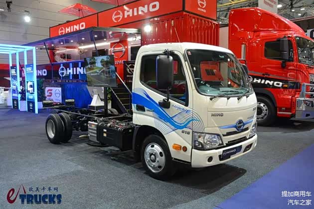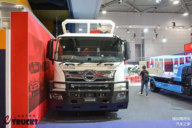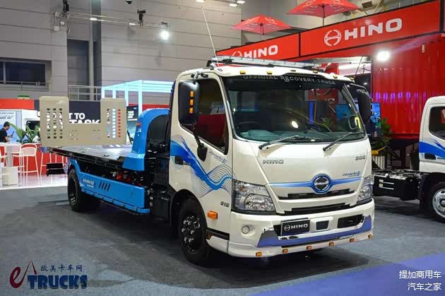 摆在它旁边的则是一台日野300混动自卸车。这款车的最大总重为7吨,比旁边的平板清障车低2吨,其余动力等部分则完全一致。