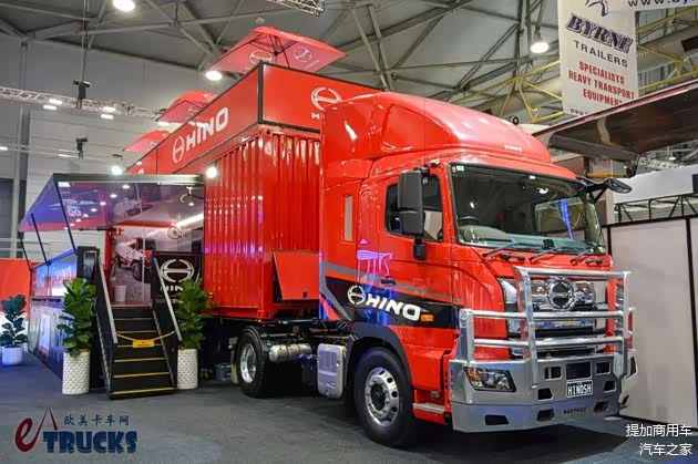 展台上还有一台日野自己的移动舞台车,其挂车经过特殊设计,可紧凑折叠收纳,展开后便成为了一个带露台的移动办公室,常见于各类大型展会活动中,核心优势就是可复用、可机动。