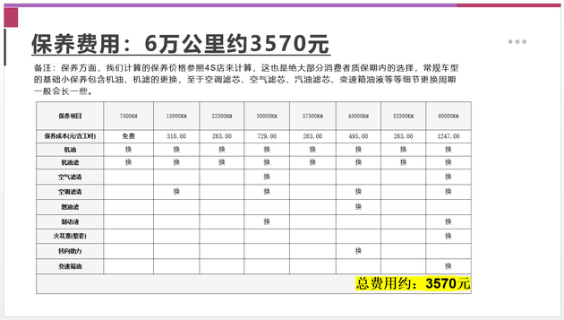 保养层面,我们按照一年2万公里的里程计算,6万公里来计算总的保养支出。根据官方保养政策,东风风神奕炫在7500km时进行首保,更换机油、机滤等,此后的保养周期同样为7500km。最终,我们大致算了一下,6万公里保养费用是3570元,1年2万公里的保养成本为1190元左右。