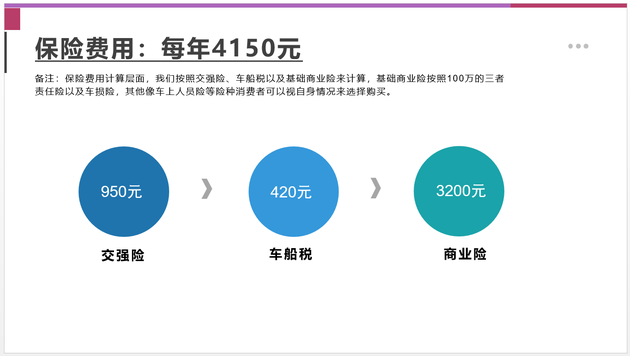 保险费用计算层面,我们按照交强险、车船税以及基础商业险来计算,基础商业险按照100万的三者责任险以及车损险,其他像车上人员险等险种消费者可以视自身情况来选择购买。我们的价格不考虑多年不出险的市场折扣价。