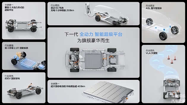 划重点,全新平台主要用于中大型以上的旗舰产品,可以覆盖SUV、MPV和轿车等不同的车身形态,除了新能源的纯电、插混和氢燃料,纯油和油电混动同样可以实现。底盘为前双叉臂+后多连杆的硬件结构,还可提供空气悬架。