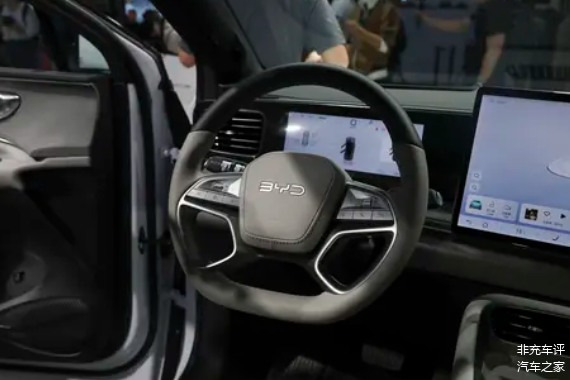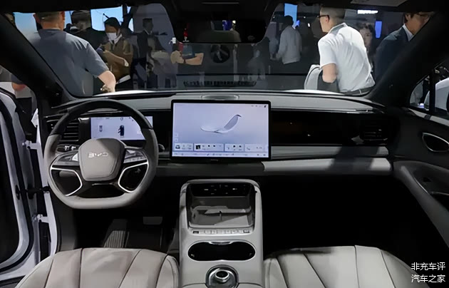 坐进车里,比亚迪那套最新的家族风格,中控台一条亮黑色的饰板贯穿,全液晶仪表是嵌进去的,中控屏还是老样子,大尺寸悬浮的。
