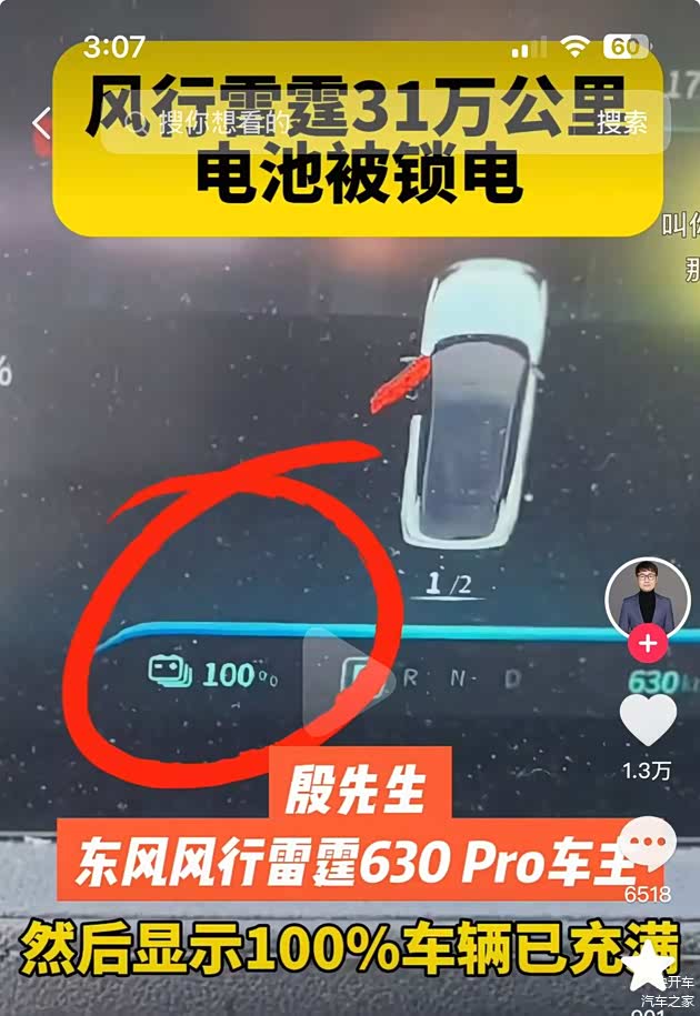 最近东风风行又惹祸了,有一名车主在2023年买了一辆东风 风行雷霆630 Pro,两年时间开了31万公里,但是车主在上个月给车辆充电的时候,发现车子只充了30多度的电,然后跳到100%。车主认为车子被锁电,然后他咨询电池厂家,厂家的人回复说这个电池在出厂的时候,就设定了“31万公里的行驶限制”。