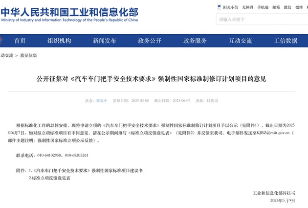 3天后的5月8日,工信部科技司公开征集对《汽车车门把手安全技术要求》强制性国家标准制修订计划项目的意见。这也标志着有关部门将对近年来广泛应用的隐藏式车门把手进行全面整顿。