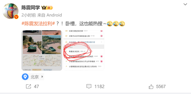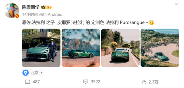 这一系列的事件在吃瓜群众眼里看来,就好像是法拉利下场硬杠小米了!你长得像法拉利也就算了,车漆也这么像,就连法拉利官方都受不了了,说到这个“受不了了”,车圈顶流陈震同学也发了几条相关的微博,一瞬间又冲上了热搜,网友们又有新瓜吃了: