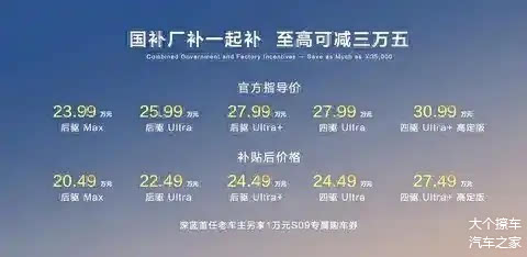 据深蓝汽车透露, 深蓝S09已经正式推向市场并开始交付,预计的价格范围是23.99万至30.99万元。这款新车被定位为增程式大型SUV,并采用了6座的设计布局,配备了1.5T的增程动力系统。经过官方的补贴,其价格范围在20.49万至27.49万元之间。