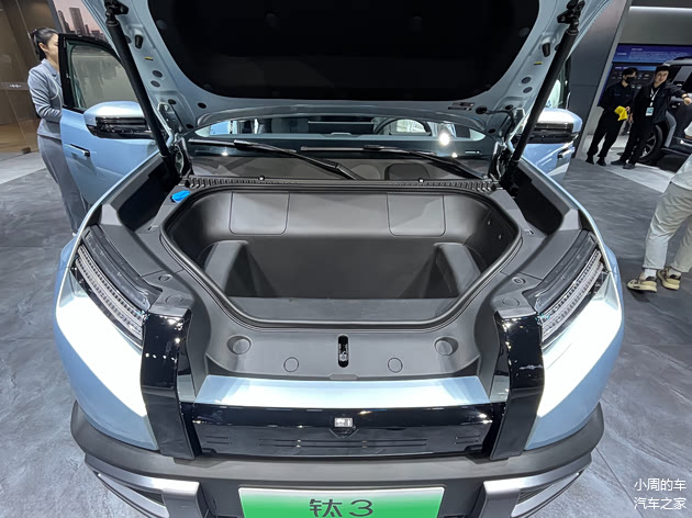 官方并没有公布钛3的后备厢容积,从实际体验来看,其装载能力与比亚迪元PLUS相当,在地板的下方,方程豹的工程师们还为其设计了三块工整的储物格,平时可以用来放一些衣物/鞋子等物品,二排座椅靠背放倒后所形成的地台也比较平整。除了后备厢外,该车还配有一个容积达151L的前备厢,中高配车型上支持电动开启,低配版本则是需要手动开启,开关按键被隐藏在中网位置。