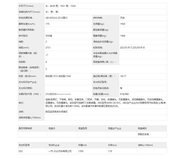 动力配置部分,新车的搭载的是代号为DLE的1.4T发动机,最大功率110kW,申报的最高车速为175公里每小时。