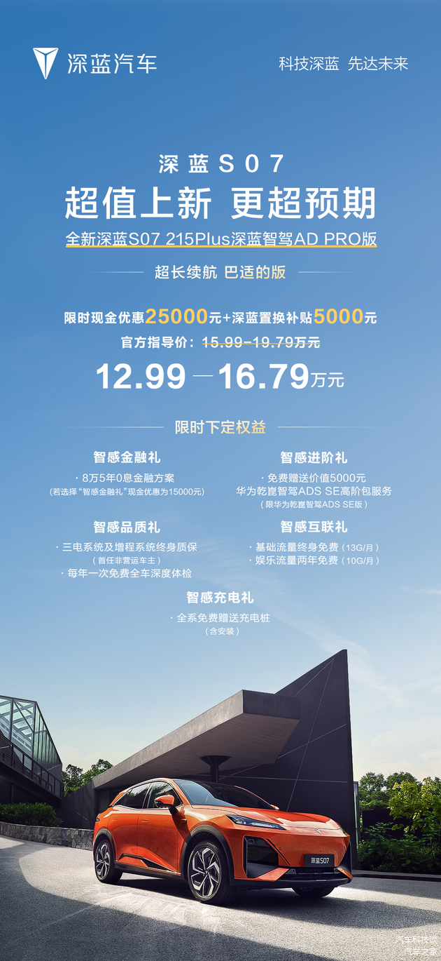 在新能源汽车市场竞争白热化的当下,深蓝汽车再度精准出击,其旗下全球大单品深蓝 S07 迎来重磅焕新,推出 深蓝S07215Plus深蓝智驾AD PRO版(以下简称深蓝S07 215Plus版)。和小米YU7这样的大热车型不同,深蓝S07 215Plus版走“超质价”路线,坐拥全球流量与全球品质。新车定价15.99万元,同时本次全系可享2.5万现金优惠,大幅降低用户入手门槛。更有覆盖用车生活全周期的丰富权益,至高可享价值7.7万元优惠,让用户“花小钱,大享受”,超省超爽超预7,以超实惠价格拥有领先同级的产品体验。