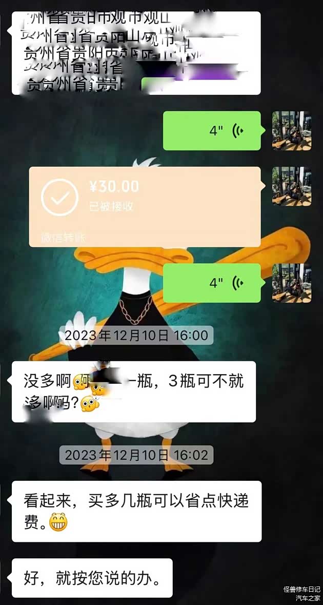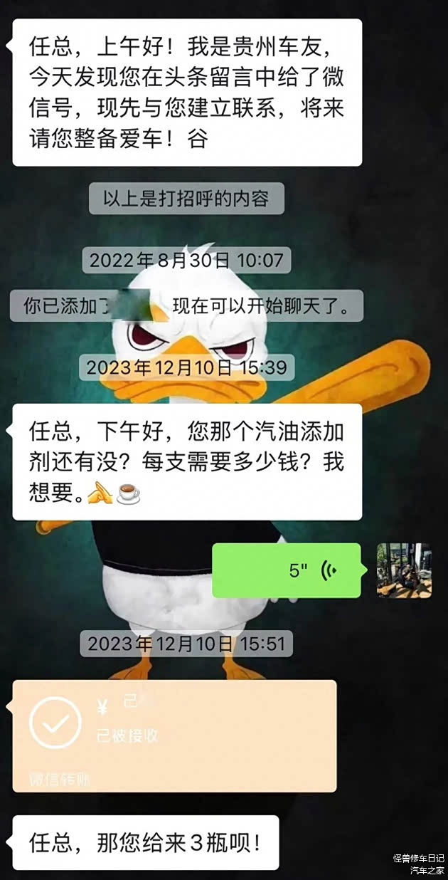 2022年车主就加我好友了,2023年从我这边拿了三瓶汽油添加剂。