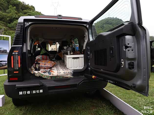 第三排座椅放倒后形成纯平空间,搭配定制充气床垫可睡两人;220V外放电接口支持电磁炉、咖啡机同时工作,搭配车顶帐篷,打造“五星级野外卧室”。