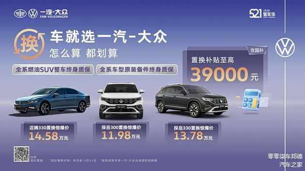 即日起至5月31号,探岳家族最高可享置换补贴3.9万元,同时还能享受到“双终身”质保。具体车型来看,探岳300TSI车型置换价低至11.98万元,探岳330TSI置换价低至13.78万元,全新探岳L一口价17.69万元起,在金融政策层面,探岳众享款可享受首付0起,84期落地价日供低至86元,大众品牌老客户增购,额外赠送2,000元保养抵用券。