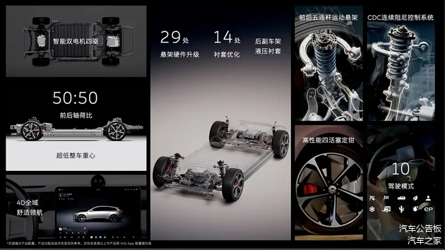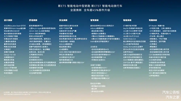 接着来看车,官方表示新车超45%的部件升级(具体可看下图),可以说变化非常大,毕竟新能源车更新换代非常快,所以也能理解。另外,新车还全系标配了ADB智能多光束大灯、18.8英寸超大尺寸W0HUD和CDC动态悬架阻尼控制,可以说看得到和看不到的地方,均能感受到新车的升级。