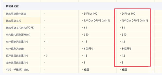 当然,对于现在的电车而言,最需要的配置,还是智驾,低配最大的问题是没有智驾,可顶配却把智驾给安排上了,辅助驾驶是DiPilot 100,芯片是NVIDIA DRIVE Orin N,算力达到了84,还有三个800万像素的摄像头,虽然都是纯视觉方案,但别忘了,这个配置的智驾基本能实现车主大多数的智驾体验了。