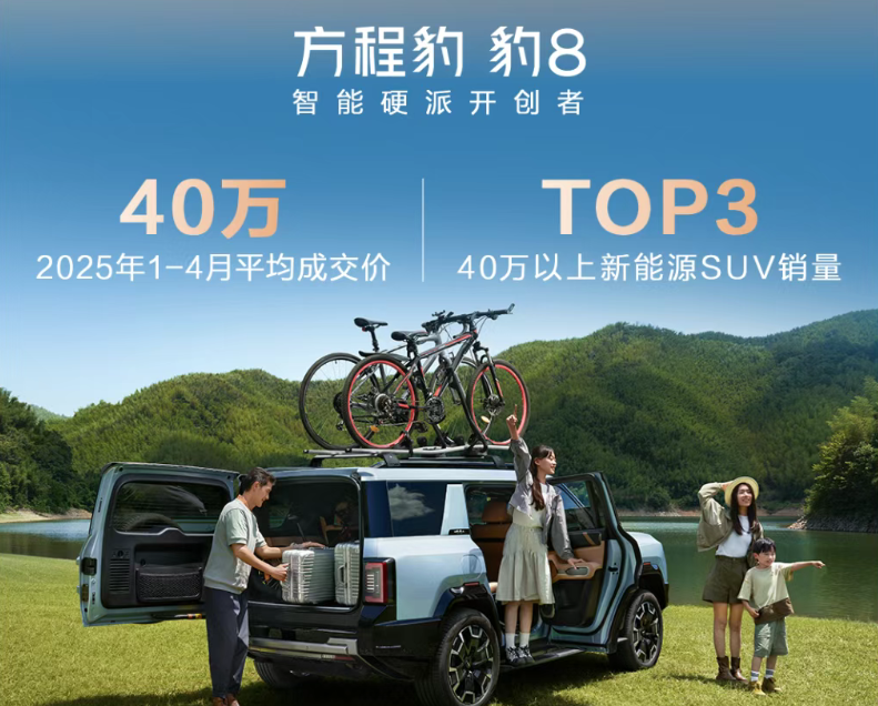 这边豹8的平均成交价超过了40万,除了有不俗的越野和加速能力之外,它还搭载了华为智能辅助驾驶系统,在今年的1-4月份排进了40万以上新能源SUV累计销量TOP3。