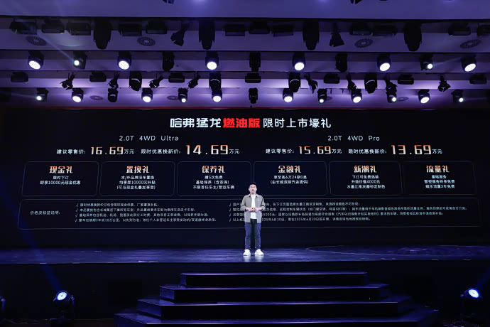 5月27日,哈弗猛龙燃油版在长城汽车集团总部正式上市。作为哈弗品牌“龙系列”的首款纯燃油车型,哈弗猛龙燃油版共推出2.0T 4WD Pro和2.0T 4WD Ultra 两款车型,官方指导价分别为15.69和16.69万元,同时在新车上市阶段可享受哈弗官方的限时优惠,换新价最低达13.69万元,同时官方还推出了6重购车权益。新车全系标配2.0T+9DCT动力总成、智能四驱系统,以及后桥电控机械牙嵌式差速锁。其中9DCT湿式双离合变速箱由长城自研。2.0T发动机最大功率输出175kW(238hp)、峰值扭矩385N·m。新车空载接近角25度,离去角32度,纵向通过角23度,最小离地间隙空载223mm满载185mm,最大涉水深度580mm,具有超强通过性。内饰部分,哈弗猛龙燃油版配备12.3英寸液晶仪表盘、14.6英寸悬浮中控屏及第三代Coffee OS智能座舱系统,支持语音交互、OTA升级等功能。后备箱还设有220V电源插座,最大额定放电功率400W,可为车载用电器设备供电,户外露营场景实用性强。可选装拖车资质,准拖挂车总质量达1600kg,垂直载荷160kg。