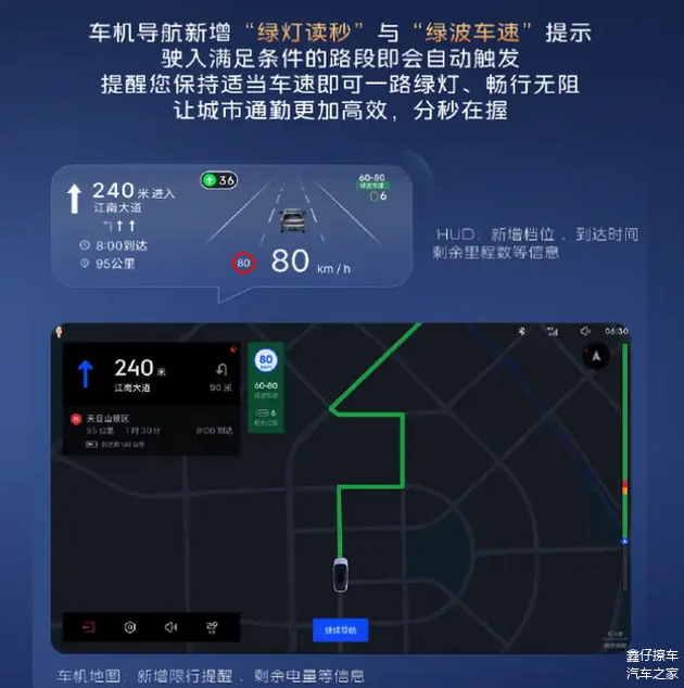 在智能导航方面,本次版本更新引入“绿灯倒计时”与“绿波速度提示”功能。当车辆行驶至具备信号灯感知的路段,导航界面将实时提示信号灯剩余时长及推荐通行速度,有助于驾驶员合理规划车速,缓解城市通勤频繁启停带来的效率损耗。