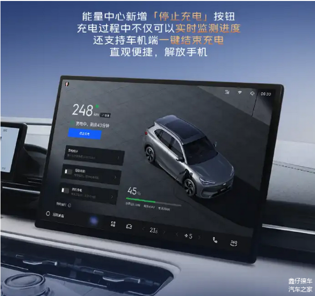 在能源管理系统方面,“能量中心”新增停止充电按钮,用户可直接通过中控屏幕终止充电流程,减少对手机依赖,操作路径更加简洁清晰。