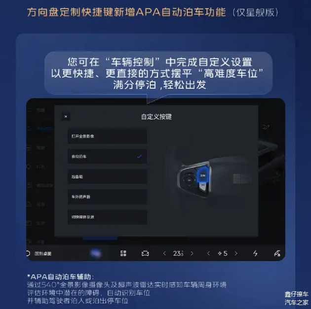 自动泊车部分,此次升级为星舰版车型方向盘快捷键新增APA自动泊车功能,配合540°全景影像与超声波雷达,实现一键启动车位识别与泊入流程,辅助用户在复杂环境中完成泊车操作。