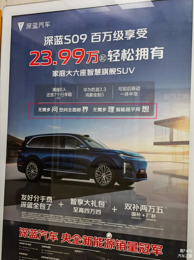 此外,之前深蓝汽车S09的电梯广告也是充满歧义。广告中“无需多问,空间全面越界”“无需多理,智能化超乎所想”的广告语,将“问界”“理想” 字样加粗竖排,进行视觉强化处理,直指新能源汽车头部品牌问界与理想。不少网友认为,这是深蓝对自己不自信,所以在广告中还要连带友商。不管是为了拉踩,还是为了蹭人家流量,邓承浩的营销思路,都算得上另类。
