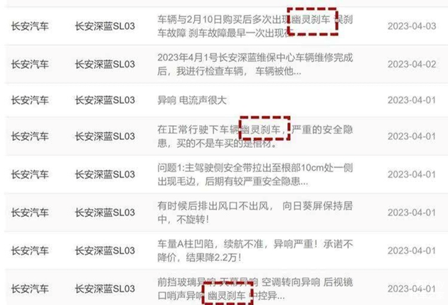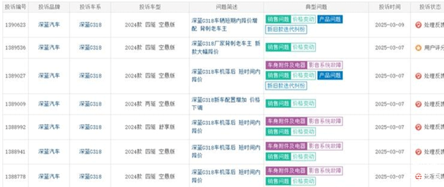 如果说“价格战”伤及无辜属于“正常”,那深蓝在产品质量上的“背刺”就说不过去了。长安深蓝SL03曾经遭遇过的“幽灵刹车”问题或许不少人还有印象,在跟车,甚至周围无车的时候自动触发紧急制动,安全性能堪忧。而原本这个问题只需要调整一下紧急制动的策略,但维修人员表示是正常现象。新出的G318更是存在无规律下电(全车断电)、车机卡顿、雷达盲区、座椅功能紊乱、空调故障、零部件生锈、异常解锁问题等诸多问题。不少消费者称其为“半成品车型”。
