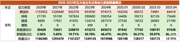 如上表,2020年时,吉利集团的总销接近120万辆,2021年国内新能源市场爆发后,吉利除了2022年有小幅下滑,其余每年的销量都是增长的,吉利并没有像长城那样在新能源时代快速后撤,反而在2024年创下了全年182万辆的销量纪录。