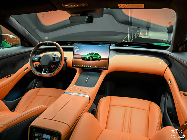 该车侧面设计识别性极强,溜背式轿跑SUV造型,配以细长车头及上扬肩线,呈现出类似法拉利Purosangue的高级动感。该车拥有4999mm,1996mm,1600mm等尺寸以及3000mm轴距,使车内空间格外宽敞。前车门侧面的进气口、21英寸的六幅式轮毂、黄色卡钳、无框电吸门和隐蔽式门把手等设计细节,都充分展示了新能源的特性。车漆选用钛金属色,熔岩橙,宝石绿及寒武岩灰多种色彩组合,满足多种审美需求。